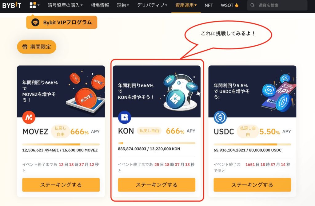なぜBybitなのかというと、新規取り扱いトークンの期間限定積立ステーキングは、年利が爆高い傾向があるという点です。