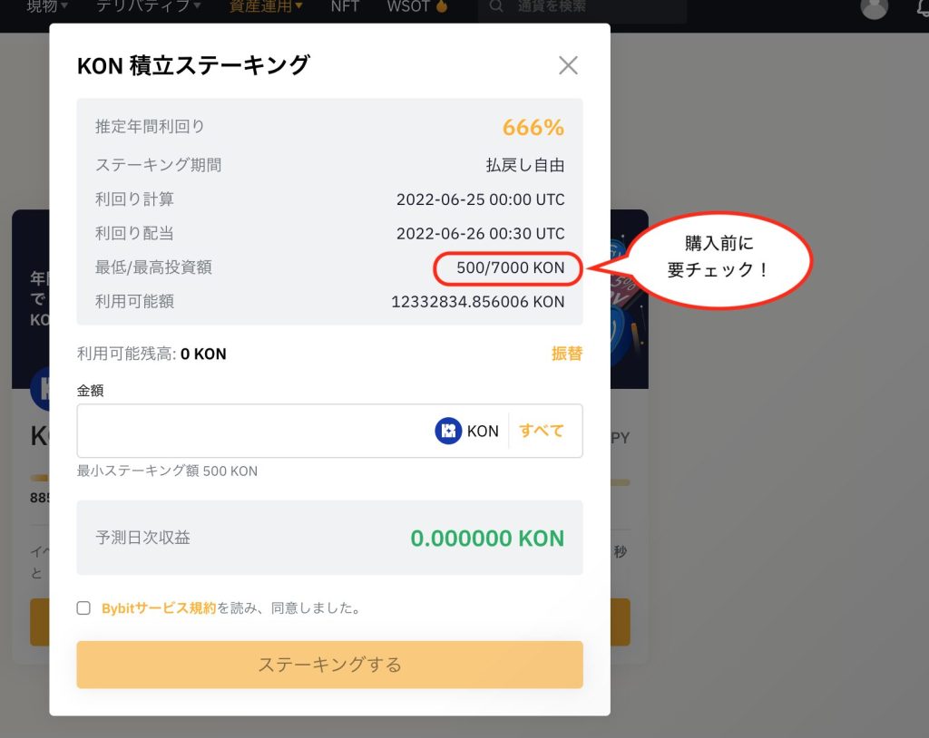 ステーキング額をきめて購入したら、KONからガス代を差っ引かれました…。